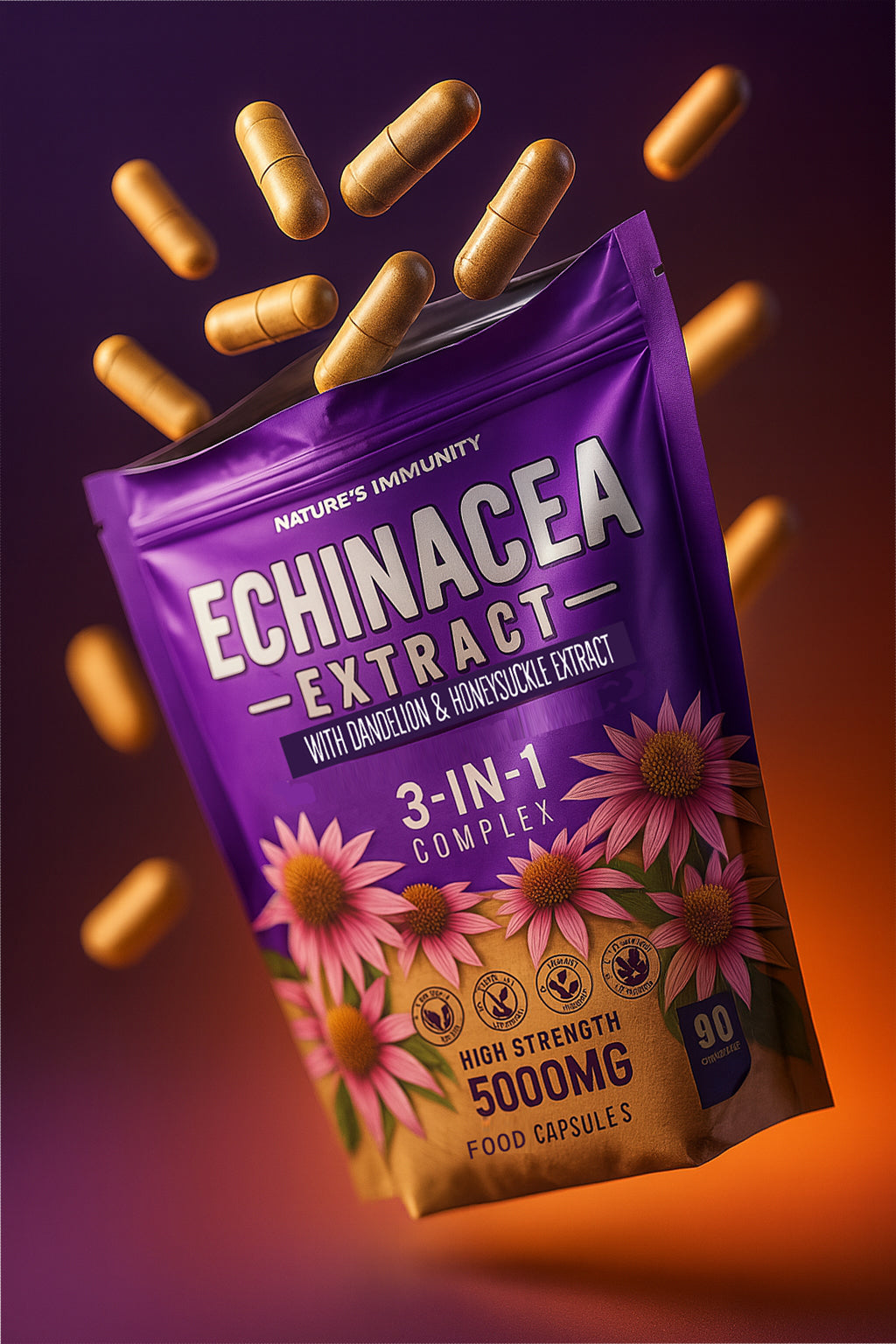 Each bag contains 90 capsules formulated with a carefully selected blend of dandelion and honeysuckle extracts. This advanced 3-in-1 formula delivers a potent 5000mg dose designed to support overall wellness. The combination of these natural ingredients is crafted to provide antioxidant benefits and promote a healthy response. Ideal for those seeking a natural supplement to complement their daily health regimen, these capsules offer a convenient and effective way to incorporate the benefits of Echinacea, dandelion and honeysuckle into your routine.